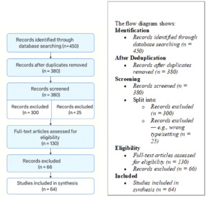 Following duplicate removal, all titles and abstracts were screened for relevance. Full texts were then evaluated against the inclusion criteria, resulting in 64 studies retained for analysis: 30 empirical (quantitative or mixed methods), 22 qualitative, 8 conceptual /theoretical, 4 policy frameworks or institutional models.