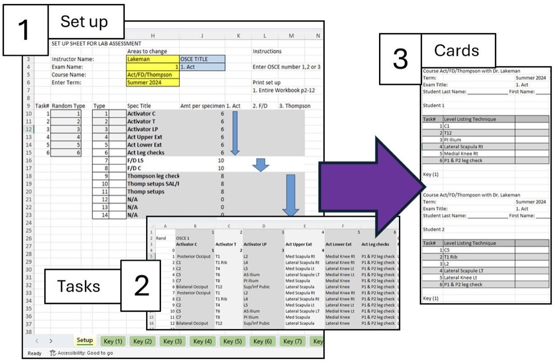 Tasks were entered within categories into a customized Excel sheet entitled “Tasks.” Another excel sheet was created entitled “Setup” that delineated which categories are used from the “Tasks” sheet related to the three OSCEs: Activator, Thompson, Flexion Distraction. The last Excel sheet entitled “Key(1)” randomized the tasks from the “Tasks” sheet according to the categories related to the OSCE in the “Setup” sheet. Within “Key(1)”, this generated a randomized list of tasks for student 1, and also a paired randomized list of tasks for student 2 that avoided duplication. Infographic is available in Figure 1.