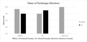 In assessing the value of the technique electives education, the preclinical faculty who taught elective courses placed a higher value on those courses than faculty who did not teach elective courses from the same department, whereas the clinical department faculty who taught elective courses valued them less than faculty who did not teach elective courses from their department. All elective course faculty members who taught technique elective courses placed the highest value on the elective courses. (Figure 3)