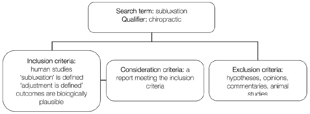 I report this systematic review in brief. My method was compliant with the principles of the Cochrane Handbook (Ver 5.1) for Systematic Reviews of Interventions3 and met the Core Standards.4 The purpose was to retrieve and assess the current state of quantitative evidence about subluxation with an expectation to find an association of causation between subluxation and health status. My target population was humans and my strategy was informed by my knowledge of the primary chiropractic literature.