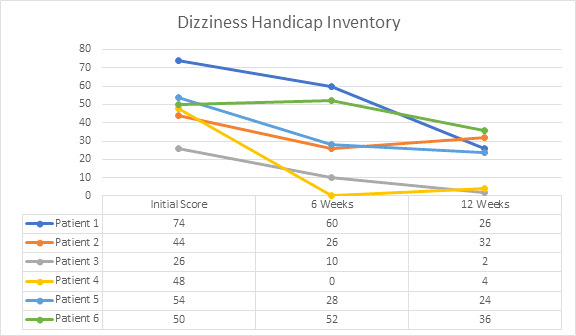 The Rivermead Post-Concussion Questionnaire showed an improvement in scores in all 6 patients, most noticeably after 6 weeks of care. (Figure 4a)