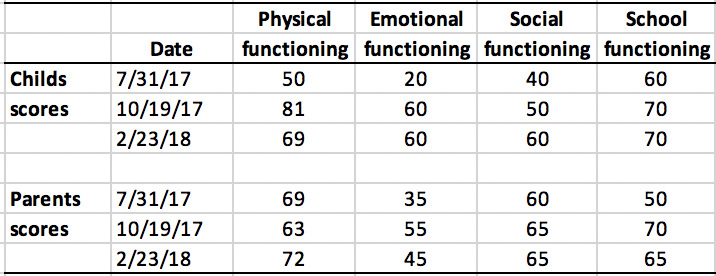The patient and parents completed the Pediatric Quality of Life Inventory version 4.0 generic core scales (PQLI)10 (Table 1). This is a reliable measure of the child’s health-related quality of life as rated by the parent as well as the child.10